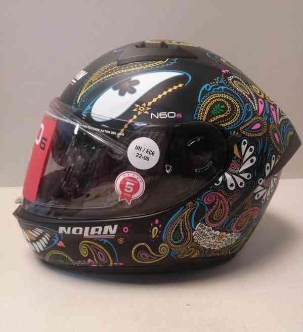 Silniční přilba od italské značky Nolan model N60–6 Ritual (černá matná/zlatá/růžová) ve velikosti – XS (54/55). Nová, nepoužitá samozřejmě výborný stav, včetně homologace.