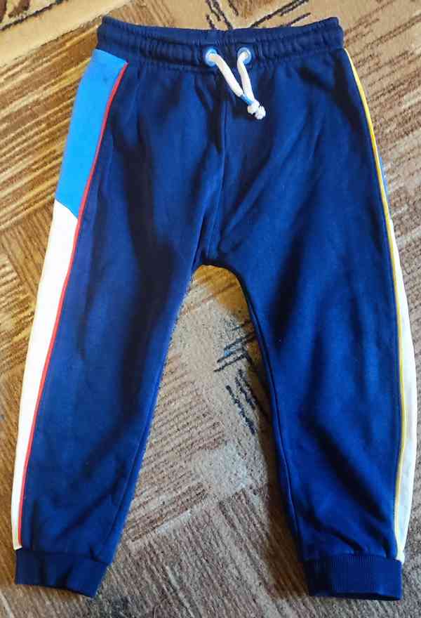 Tmavě modré tepláky s pruhy po stranách, v pase šňůrka na stažení. George, vel. 3-4 roky (98-104cm), pas v klidu cca 2x24 cm, délka cca 55 cm. 80% bavlna, 20% polyester. Nošené.