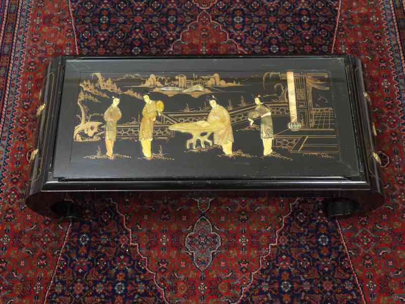 Čínský snídaňový stolek z druhé poloviny 20. století. Konstrukce z masivního dřeva s černým lakem, bohatě figurálně zdobená tradičními čínskými motivy. Deska i boční plochy jsou dekorovány jemnou ruční malbou a rytou technikou, doplněnou o plastické figurální aplikace z kostěného materiálu. Výjevy zachycují dvorní a zahradní scény inspirované klasickou čínskou ikonografií.