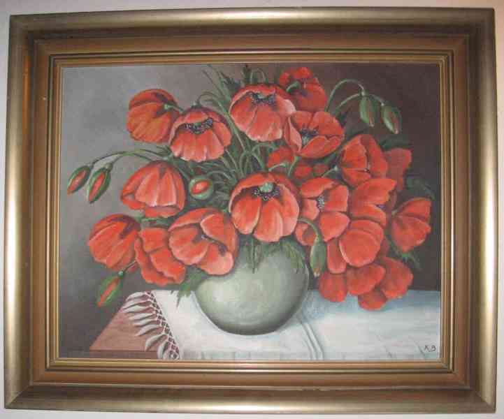 nabízím obraz máky 77,5cm x 63,5cm ,malováno na desce,signováno, obraz svatý ,rozměr 106 x 63cm i s rámem ,rám místy oprýskaný , v dolní části v desce prasklina,obraz malováno akryl zaskleno rozměr 62cmx 47 cm cenu nabídněte