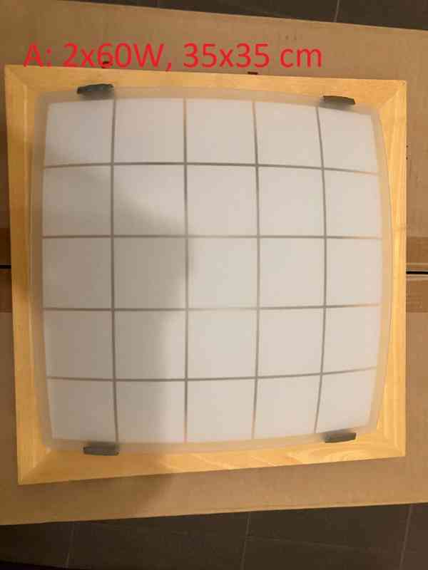B: 1x60 W, 30x30cm, vč. úsporné žárovky 9 W, 380 Kč. Patice E27. Cena za obě 750 Kč. Rám: světlé dřevo, stínítko: mléčné sklo, základna: plech. Upevnění 3 vruty. Perfektní stav - jako nové. Chýně okr. Praha-západ, případně zašlu Zásilkovnou.