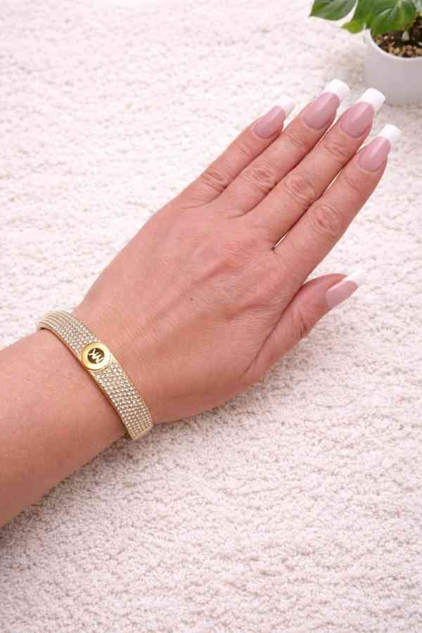 Elegantní nový, nikdy nenošený originální náramek Michael Kors ve zlatém provedení. Luxusní pevný dámský náramek s bohatě zdobenou horní stranou jemnými třpytivými kamínky a ikonickým logem MK.