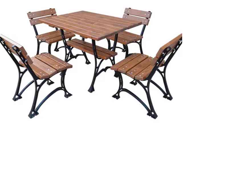Zahradní nábytek je složen ze čtyř křesel bez opěrek a jednoho stolu. Zahradní set je vyroben ze dřeva, povrchová: moření do odstínu olše. Konstrukce a nožičky jsou litinové. Rozměry stolu: 100 x 100 x 72 cm. Rozměry křesel: 75 x 40 x 48 cm. Před použitím doporučujeme výrobek znovu natřít vhodným nátěrem.