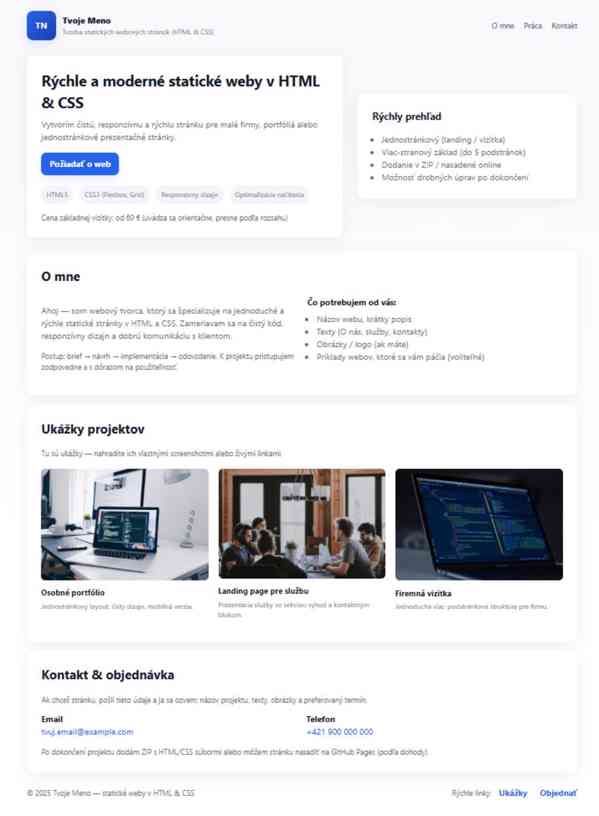 Som začínajúci webový tvorca a ponúkam tvorbu jednoduchých, moderných a responzívnych webových stránok v HTML a CSS.