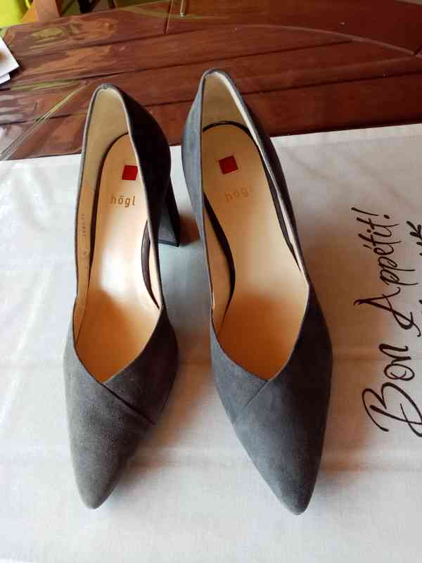 Semišové kožené elegantní lodičky zn. Högl na vysokém podpatku a přesto pohodlné v krásné barvě holubičí šedi. Výška podpatku 7,5 cm. Zcela nové pouze zkoušeny ! Bez jakéhokoliv poškození či škrábnutí ! Původní cena dost vysoká. Krásný top stav.