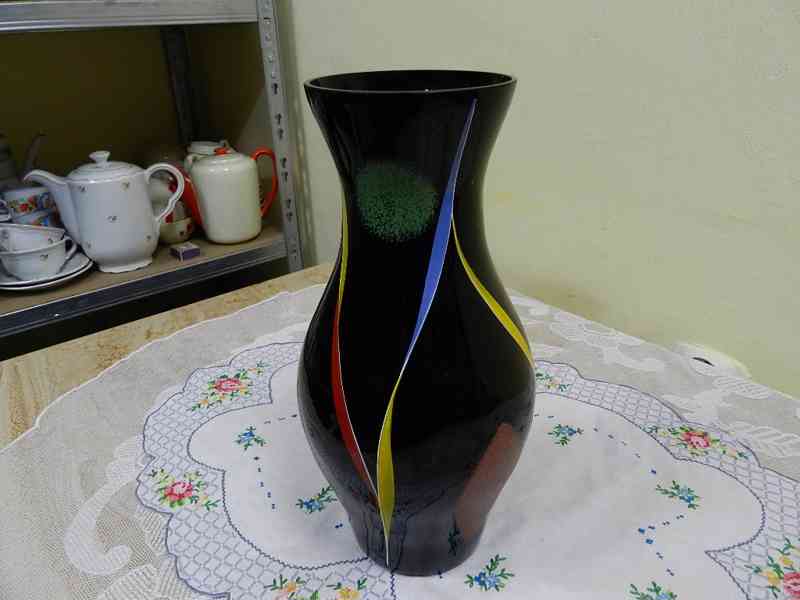 Hezká černá Váza, barevný stříkaný dekor.Rozměry: výška 30,5cm, šířka 14cm, hmotnost cca 1000g.