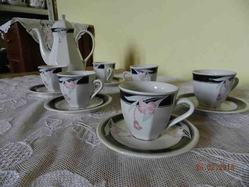 Nabízím hezký kávový set pro 6 osob - Fena Porzellan GDR Sasko za super cenu!!!Průměr talířku 11,5cm, hrnku 6,5cm.Celkem 13 kusů.