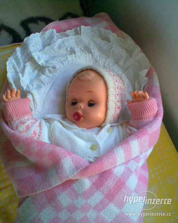 mrkací plačící panenka v retro oblečení, zavinovačce, dece, má dudlík, chrastítko, pískací hračku, botičky