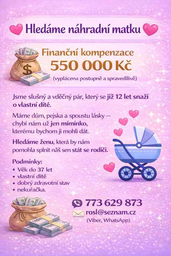 Jsme šťastný pár ze západních Čech a náš život by mohl být téměř dokonalý – máme krásný domeček, věrného pejska, skvělé přátele… ale pořád nám něco chybí. Toužíme po miminku, které by naplnilo náš domov další láskou a smíchem.