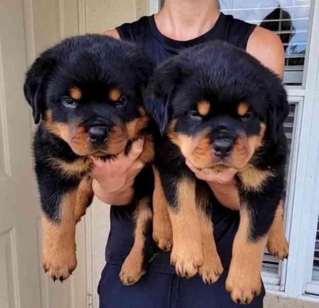 Máme dve štenátka Rotvajlera. 10 týdnu. Domov vyvýšený a již rozbitý dum. Mají zdravotní osvedcení a první ockování.