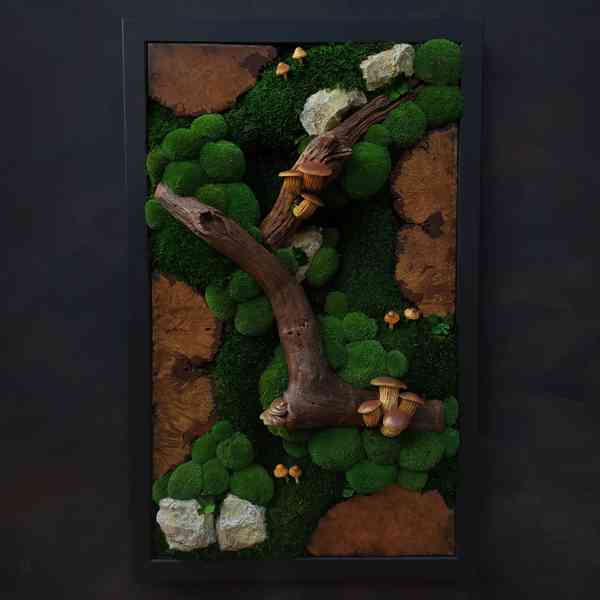Obrazy jsou ručně vyrobené ze stabilizovaného mechu, rostlin a sušených hub tzn, že jsou bezúdržbové.