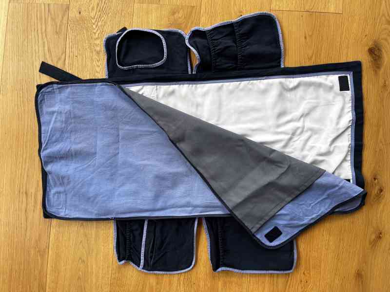 Praktická přebalovací podložka o rozměrech 38 x 85cm v rozloženém stavu. Sbalená jen na velikost 18 x 25 x 8cm. Obsahuje 4 kapsy a také dvě objímatelné podložky, které jsem ještě podšila kočárkovinou.