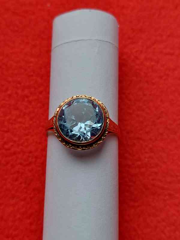 Zlatý prsten s topasem. Hmotnost 2,9 gramu, ryzost 14 karátů, puncováno. Velikost 13 mm, průměr návleku 18 mm.