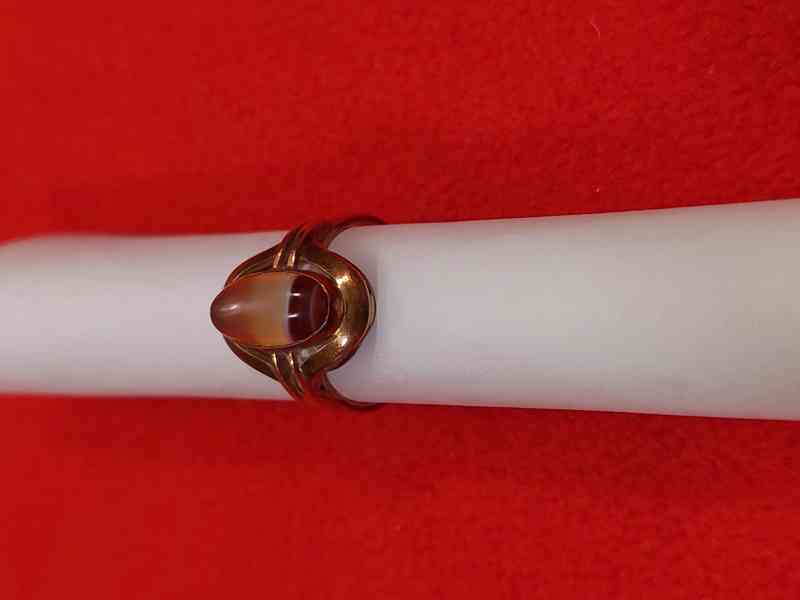 Zlatý prsten s achátem. Hmotnost 3,2 gramu, ryzost 14 karátů, puncováno - český punc. Velikost 17 mm, průměr návleku 17 mm.