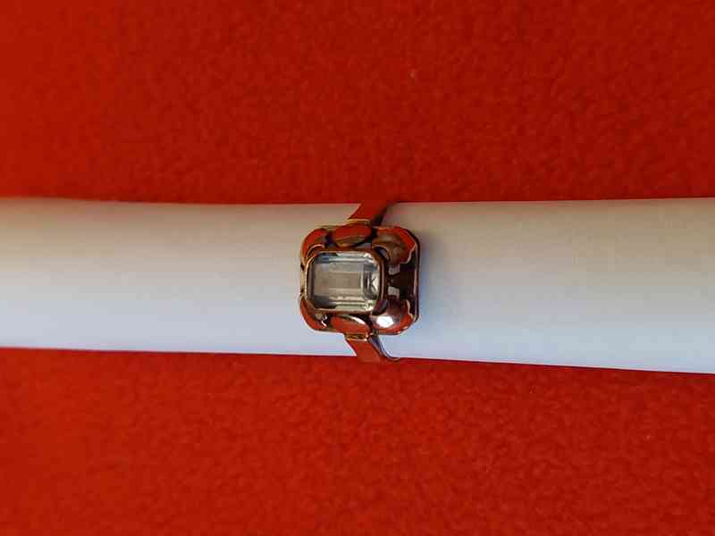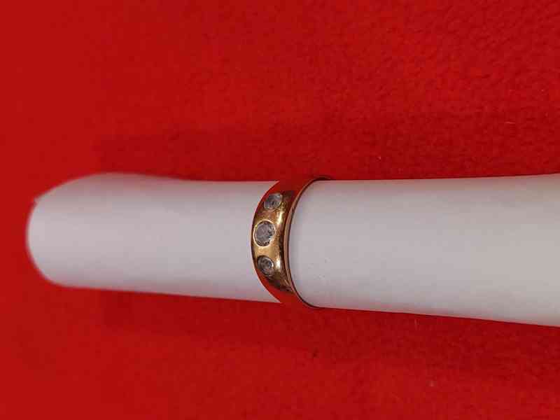 Zlatý prstýnek s kamínky. Hmotnost 2,9 gramu, průměr návleku 18 mm.