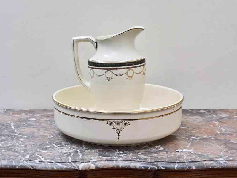 Souprava je v dobrém původním stavu, bez prasklin, s přirozenou patinou a drobnými stopami stáří, které podtrhují její autenticitu. Vhodná jako dekorativní doplněk historického interiéru, pro sběratele nebo jako stylový prvek do klasických koupelen či ložnic.