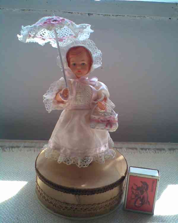 retro celuloidní panenka s deštníčkem na krabičce v které jsou korálky, zrcátko, aj.