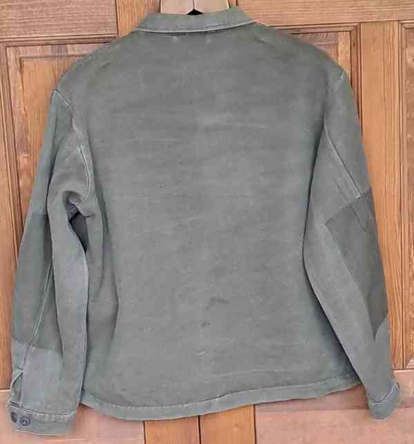 Prodám dámské khaki montérky sadu, pevnější materiál. Kalhoty délka 102-3 cm, pas 90 cm, boky 110 cm, šířka dole 22 cm, 5 knoflíků, tkaloun, 2 kapsy. Bunda délka 65 cm, ramena 50 cm, hrudník 61 cm, boky 59 cm, rukáv 56 cm, 6 knoflíků, límec, 2 kapsy. Použité, neroztrhané, pár skvrn. Cena 100 Kč + poštovné.