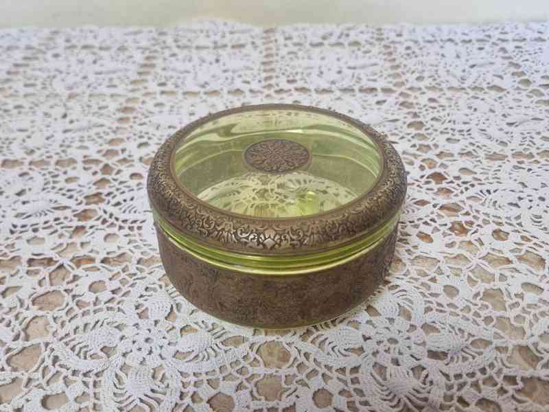 Luxusní uranová dóza s oroplastikou - Moser Karlovy Vary, 20 stol.Rozměry: výška 7,5cm, 12,5cm.Fotky jsou bohužel špatné, moc světlé, dóza je ve skutečnosti tmavší.