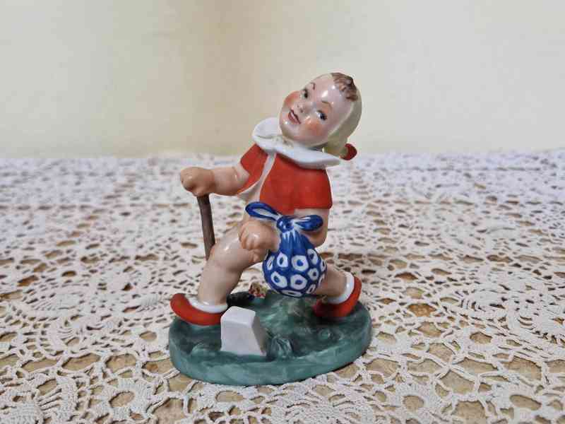 Krásná Art Deco porcelánová soška, Děvčátko s uzlíčkem - značeno, Marie Fischerová Kvěchová, Březová u Karlových varů, 1 pol 20 stol.