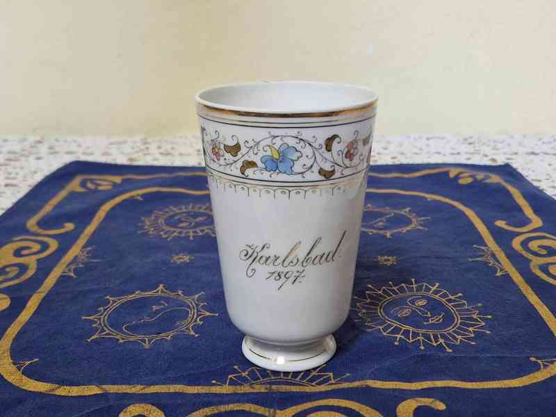 Hezký zlacený ručně malovaný lázeňský pohárek Karlsbad 1897, pěkný zachovalý stav.
