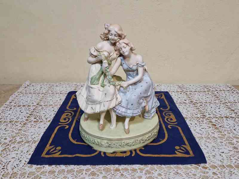 Krásné secesní masivní sousoší větší velikosti, Dvě dívky - Royal Dux, kolem 1920.