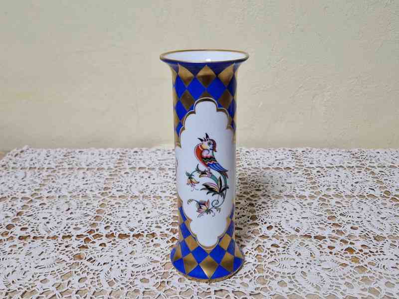 Vzácná porcelánová váza bs ptáčky, šachovnicový dekor, modro-zlatá barva s pestrobarevnou ruční malbou - Horní Slavkov, Jubilejní zlatá značka 1932-1935.