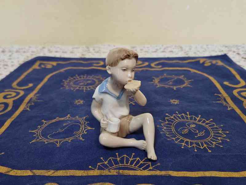 Hezká porcelánová plastika, Chlapec se svačinou, Royal Dux, 2 pol. 20 stol.