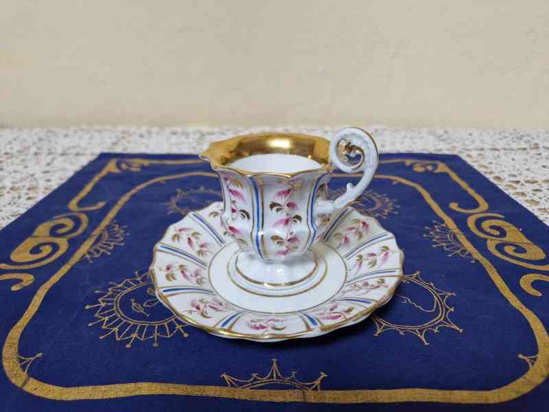 Krásný ručně malovaný a zlacený Hrnek s podšálkem - Značeno na obou kusech vtlačenou značkou NGF, Kysibl, 1 pol. 19 stol.