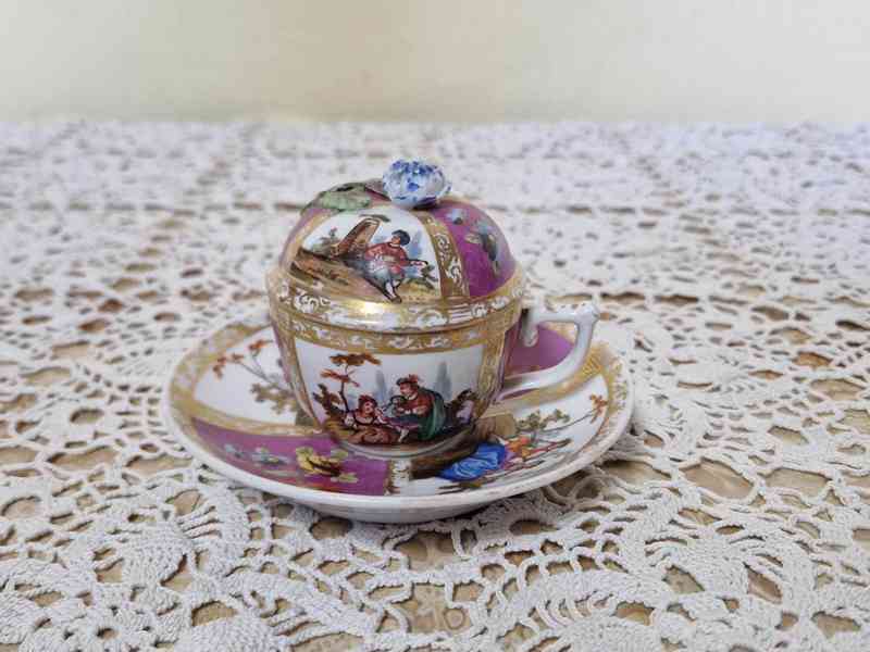 Luxusní porcelánový Hrnek s poklopem a podšálkem, galantní motivy, bohatá ruční malba - značeno Míšeňskou značkou, 19 stol.