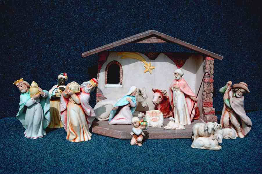 Ručně malovaný betlém vyrobený z umělého kamene, 13 figurek, rozměr stavby cca 30x25x15 cm. Původní cena 3 600 Kč.