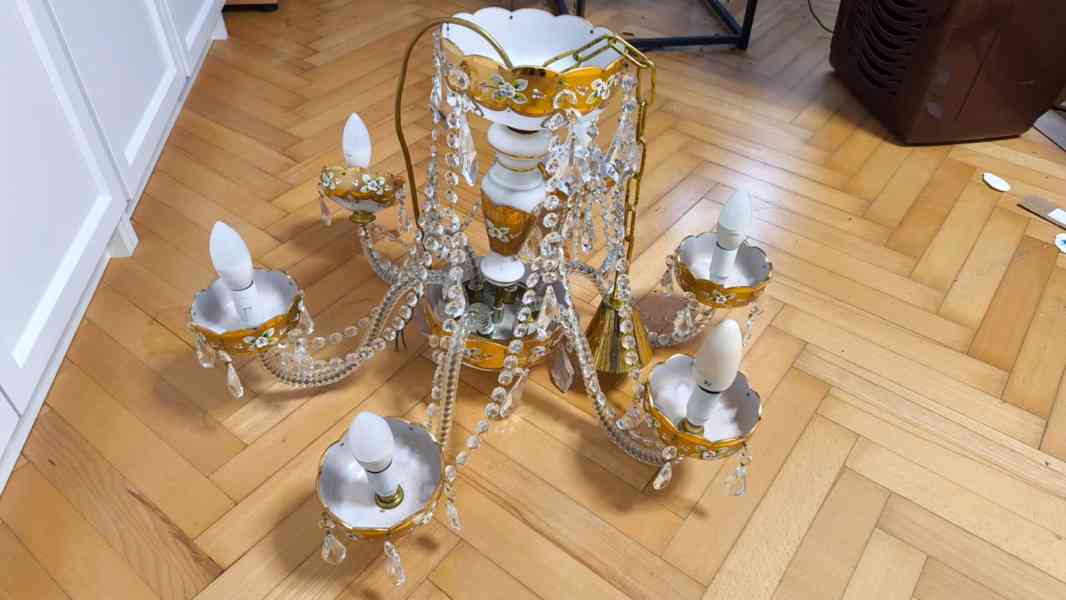 Prodám nádherný, šestiramenný lustr od prestižní české sklárny Bydžov. Jedná se o kvalitní, ručně malovaný a pozlacený kus, který dodá interiéru punc luxusu a elegance. Design zahrnuje charakteristické skleněné misky ve tvaru květů s ruční malbou, z nichž visí křišťálové ověsy.