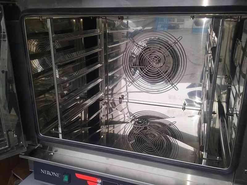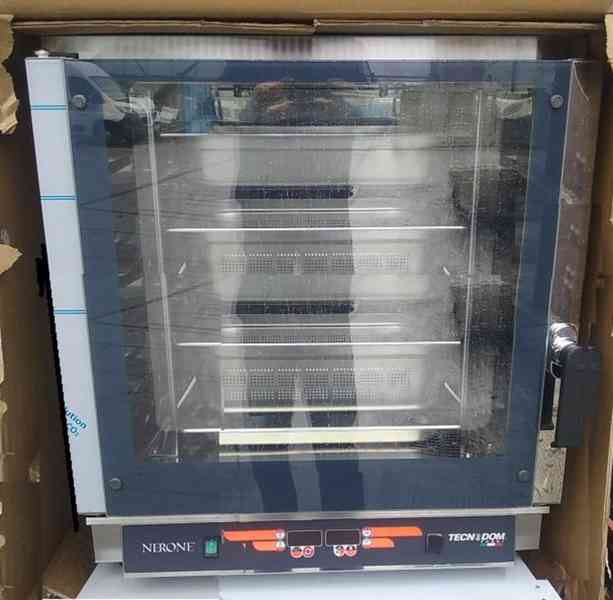 Konvektomat základní jednoduchý s kapacitou 5 x 1/1 GN nebo 5 x plech 600 x 400; . Vhodný pro menší provozy, s jednoduchým ovládáním, nastavení: teplo, čas, pára %, digitální ovládání, Delta T pečení; odstup zásuvů 84 mm; oboustranné otáčení ventilátoru, nástřikové provedení, sonda, vyrobeno v Itálii. Výkon 6,45 kW / 400 V; rozměr: 840 x 910 x 750 mm. Cena: 70.990,- Kč vč. DPH + doprava. (kód: T745650)
