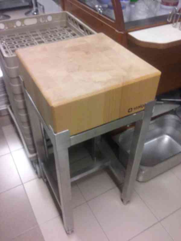 Špalek na maso na porcování a zpracování masa, nerezová podstava, která má nastavitelné nohy a zarážky v rohu podstavy. Dřevěný špalek z bukového dřeva, síla – výška dřeva 150 mm; celkový rozměr ŠxHxV: 400 x 400 x 850 mm. Cena 7.990,- Kč vč. DPH + doprava. (kód: S684416)
