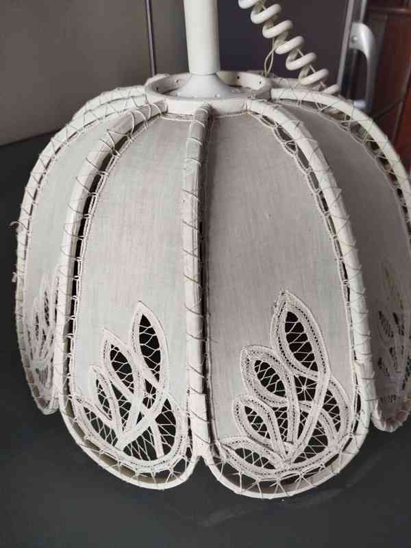 látkový lustr, používaný ale ve výborném stavu. Výška klobouku asi 25 cm, šířka 43 cm. Kostra z lehkého dřeva, látka smetanová barva