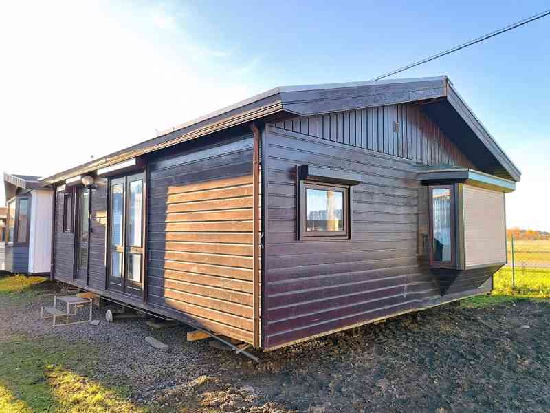 Tento stylový a vybavený mobilní dvojdomek nabízí komfortní a útulné bydlení vhodné pro celoroční využití. Díky venkovnímu dřevěnému obložení přirozeně zapadá do okolní přírody. Vyvýšený strop dodává interiéru vzdušnost a pocit prostornosti, zatímco koberec po celé ploše přispívá k příjemné domácí atmosféře a tepelné pohodě. Celková obytná plocha bez přesahů činí 52 m², což nabízí dostatek prostoru pro pohodlné a funkční užívání.