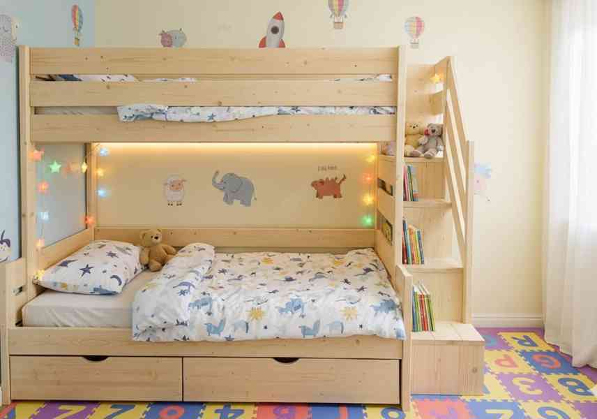 Patrová postel s vysouvacím lůžkem a dvěma úložnými šuplíky na kolečkách. Materiál masiv, borovice. Možnost upevnění žebříku na obě strany postele. Včetně matrací (2x 190x80x12 pro pevná lůžka, 1x 185x80x8 pro výsuvné lůžko). Minimálně používaná.