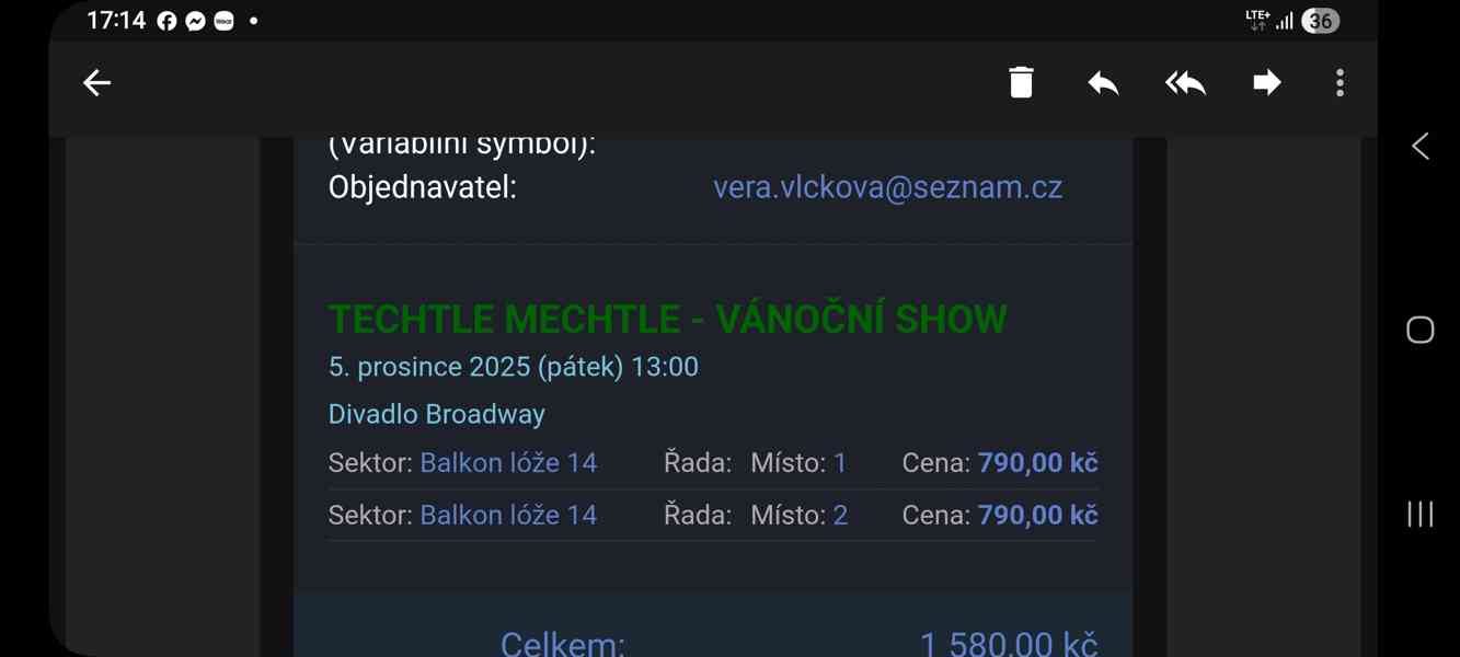 Dobrý den, nabízím dva lístky na Vánoční šou Techtle Mechtle, divadlo Broadway pátek 5.12.2025 ve 13 hodin. Lístky jsou na lóže na balkóně.