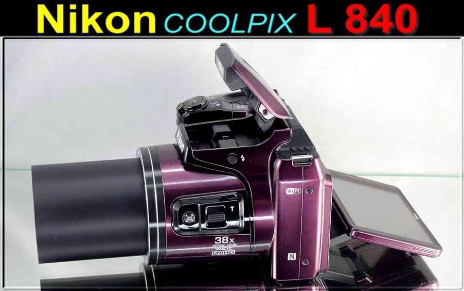 Nikon Coolpix L840 je kompaktní ultrazoom s rozlišením 16 MPix a optickým zoomem 38x. Má velký výklopný displej a mechanickou redukci vibrací. Je vybaven Wi-Fi s NFC. Natáčí FullHD video.