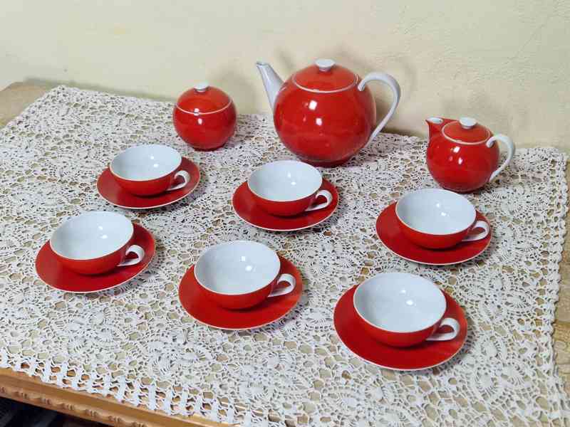 Luxusní Art Deco servis pro 6 osob, barva červená, každý kus je značen - Družstevní práce, vyrobila porcelánka Loket, Ladislav Sutnar.Rozměry: hrnek výška 5cm, šířka 12cm, podšálek 15cm.U jednoho šálku vlasovka, viz posl. foto, šálek nezvoní je pevný, servis je kompletní, celkově krásný velmi zachovalý stav!