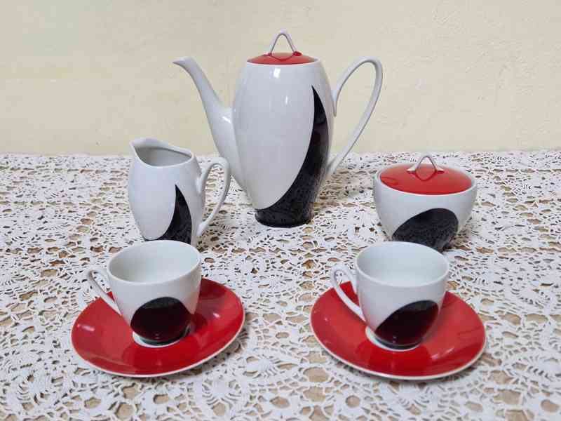 Nabízím stylový bruselský mokka servis pro 2 osoby - Josef Hahn, Loučky Cornelia Czechoslovakia, kolem 1956.Konev 19cm, hrnek výška 6cm.