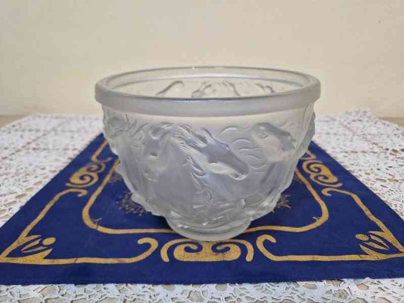 Krásný Art Deco, vysoce reliéfní a špičkově zpracovaný obal na květináč ve stylu Lalique, 12 koní po celém obvodu, čiré matované sklo - Schlevogt, Jablonec, 30 léta 20 stol.Rozměry: výška 15,5cm, průměr 20cm.