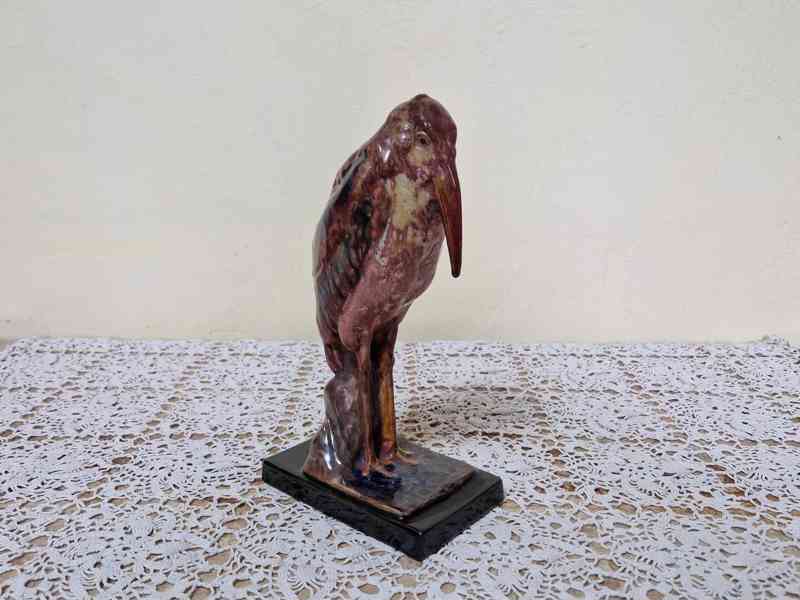 Krásná keramická soška Marabu, větší velikost, zajímavé zpracování, stékané glazury - Čechy, 1 třetina 20 stol.Rozměry: výška 27,5cm