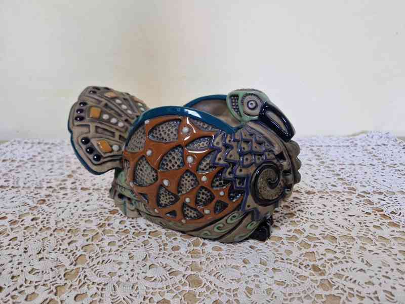 Nevídaná secení mísa ve tvaru Krocana, bohaté zdobení, plastický reliéf - Značeno, Amphora Teplice.Rozměry: výška 15cm, 27 - 16cm.