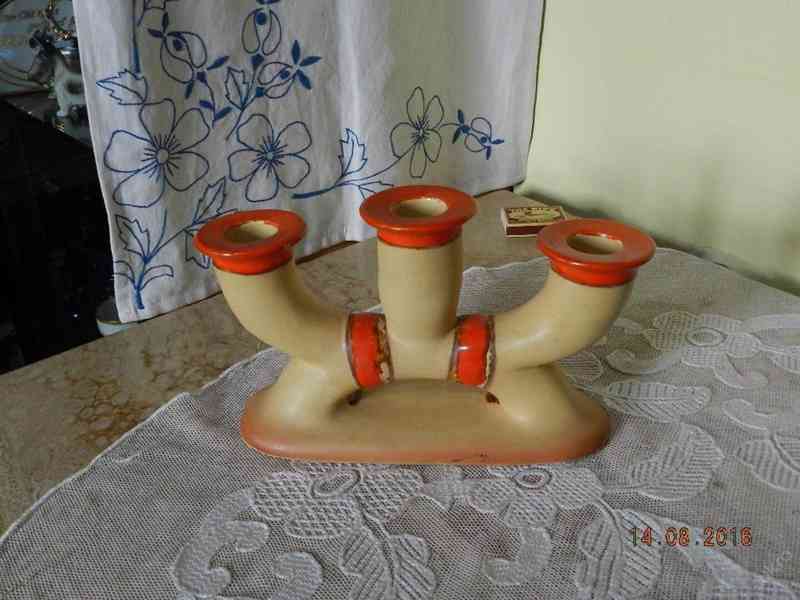 Hezký keramický svícen - Německo.Rozměry: výška 14,5cm, šířka 25cm, hloubka 8,5cm, váha 750g.