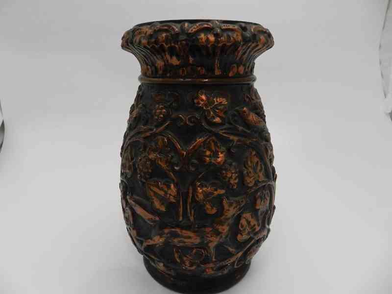 Plasticky zdobená Váza, lišky a ptáčci, keramika s měděným povrchem - galvanoplastika - Johann Maresch, 1 čtvrtina 20 stol.Rozměry: výška 26cm, průměr 17cm, hmotnost cca 1780g.