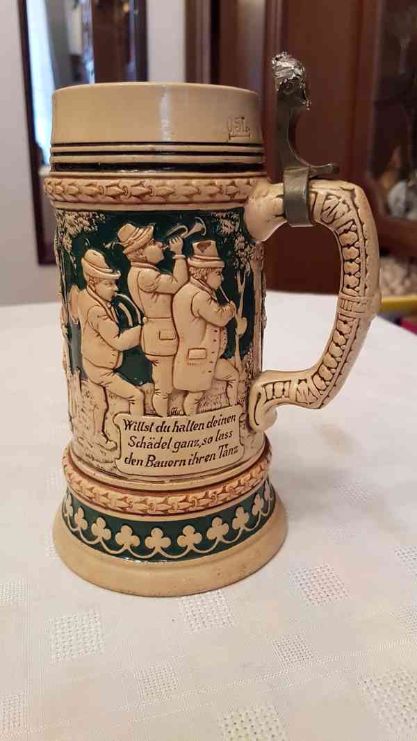 Prodám dva staré, ručně malované a glazované kameninové krýgly (pivní holby) s figurálním cínovým víčkem. Výška 20 cm, druhý 20,5 cm. Ruční výroba, plně funkční, ale i pro sběratele. Cena za 2 kusy 1400,- Kč, možno i jednotlivě. Osobní předání na Praze 3, nebo zaslání přes Zásilkovnu. Volejte 770 630 523, nebo pište na morgiana007@gmail.com