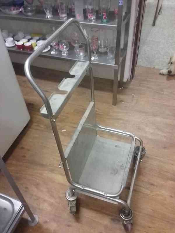 Nerezový vozík univerzální, např. na odpadkový koš s možností umístnění smetáku, lopatky; převoz ubrusů, chafing dish, zboží, atd.. Vozík využijete v kuchyni, restauraci, hotelu, pensionu, výroba, dílna, atd., i na jiný účel. Madlo a 4 velká kola umožňují jednoduchý převoz. Vozík předváděcí na výstavě, velmi málo použitý. Rozměr Š x H x V: 480 x 480 x 950 mm. Cena: 1.490,- Kč + doprava. (kód: 080217-2)
