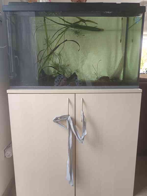Prodám starší akvárium se skříňkou 120 l, rozměr akvária 80x40x35 cm. Rozměr je bez víka. Je potřeba vyměnit zářivky, ale svítí. Včetně topení.