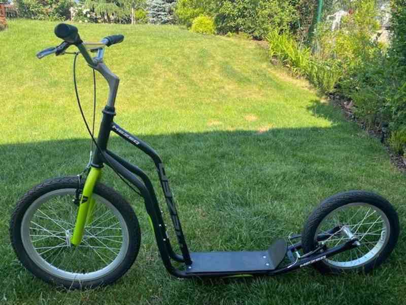 Nosnost 150kg, hmotnost 11kg, ocelový rám, pneumatiky 20"/16", hliníkové ráfky, stupátko 36cm, ocelový stojánek, brzdy 2x "V" alu, šířka řídítek 65cm, výška řídítek 96/102cm, délka 153cm.